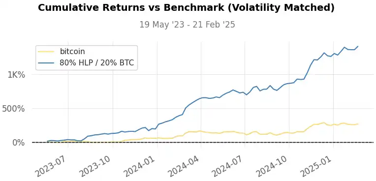 80% HLP + 20% BTC 组合将累计回报提升至 175%,同时波动率降至 16%,Sharpe 比率达 3.6。若对该组合加杠杆至匹配比特币波动率,累计回报可超 1000%。