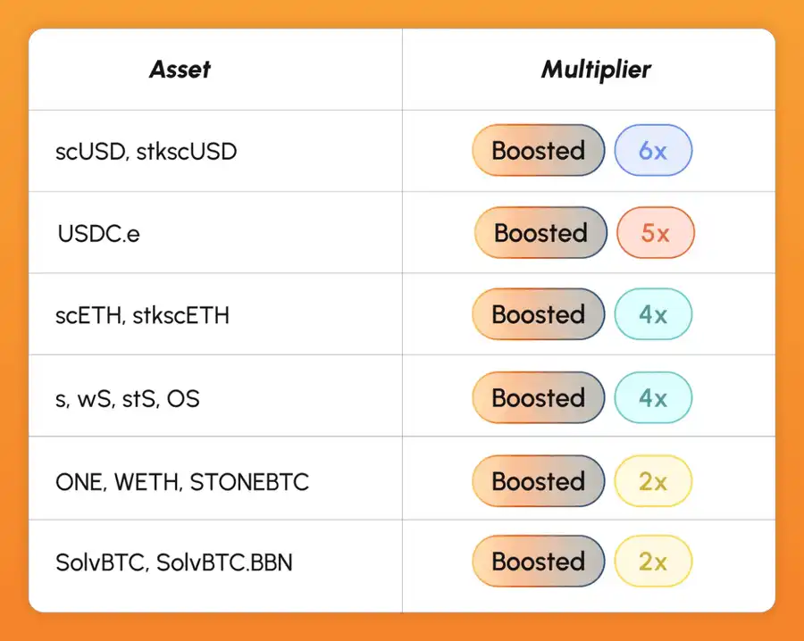 · 使用 Sonic 的 DeFi 协议,包括 staking $S、在 DEX 上提供流动性、yield farming 等。DeFi 活动的积分加权为 2 倍于仅持有资产。
