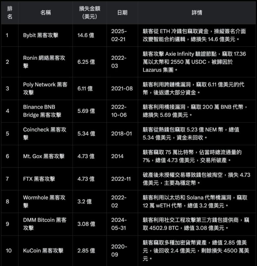 1. Bybit 黑客攻击(2025 年 2 月 21 日,14.6 亿美元)