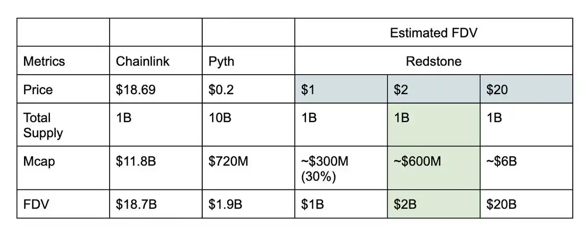 市面上领先的 oracle 项目 FDV 均达到数十亿美元,同为领先的预言机协议,将 RedStone 与 Chainlink 和 Pyth 对比可以更好推测出 RED 代币价格: