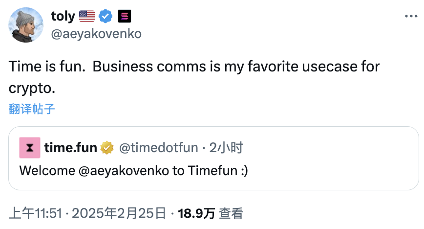 市场低迷的状态下,$TOLY 的确迅速引起了注意力,而且时间正值大盘崩盘、Solana 距离 ATH 腰斩,此时从 Base 链迁移来 Solana 的 time.fun 也让人多了一点想象空间。