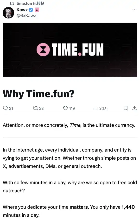 对于赛道曾经的龙头项目,time.fun 创始人 kawz 在社交媒体平台发文表示,「Friendtech 是我认为加密基础设施已经准备好的第一个社交平台。低成本的 L2、嵌入式钱包和便捷的法币进出平台。」在此基础上,time.fun 选择用用时间来定价创作者的访问权限,或者说,time.fun 选择在这个注意力经济的市场里,用时间作为最终的货币。