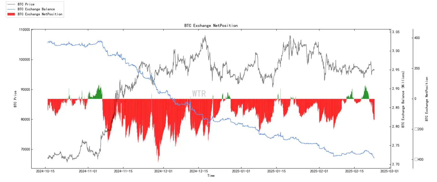 BTC 交易所净头⼨持续性⼤量流出累积。