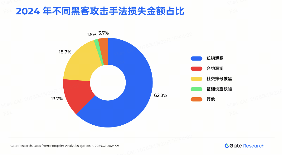 据 Gate 研究院报告,截至 2024 年 11 月,区块链生态系统累计发生 1,740 起公开安全事件,总损失高达 337.44 亿美元。其中,仅 2024 年就发生 369 起事件,造成 23.08 亿美元损失,显示黑客攻击已成为持续性威胁。尤其是私钥泄露事件,占所有损失的 62.3%。