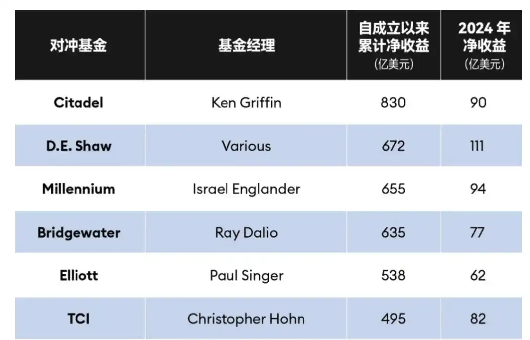 据 LCH Investments 数据显示,2022 年,排名前 20 位的对冲基金公司总共创造了 224 亿美元的收益(扣除费用后),其中位列第一的 Citadel 在 2022 年的收益达到 160 亿美元,并创下对冲基金公司的年度回报新高。今年最新的数据显示,成立以来的净收益和估值排名的所有全球对冲基金中,Citadel 仍位居榜首,桥水基金位列第四。