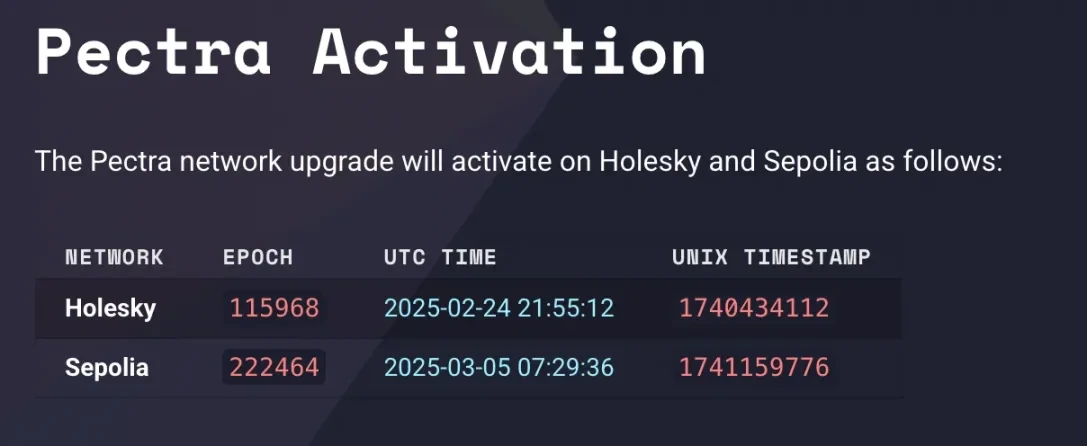 2 月 24 日,Pectra 升级在 Holesky 测试网上线;3 月 5 日,Pectra 将在 Sepolia 测试网上线。