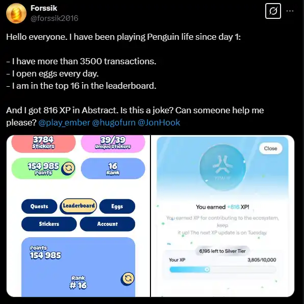 Vibes(Pudgy TCG) 是基于胖企鹅 IP 的卡牌游戏,而 Pudgy World 差不多就是一个胖企鹅「QQ 宠物」吧。这两个游戏,一个要在手机上安装 App 来玩,另一个要安装 PC 客户端来玩。虽然是自家嫡系,但似乎并没有因为这个原因就有特别照顾这两个游戏的玩家。比如下面这位 Penguin Life 玩家声称,自己从第一天开始就每天都在玩,累计超过 3500 笔交易,排在排行榜的第 16 名,但是上周仍然只拿到了 816 点 XP。