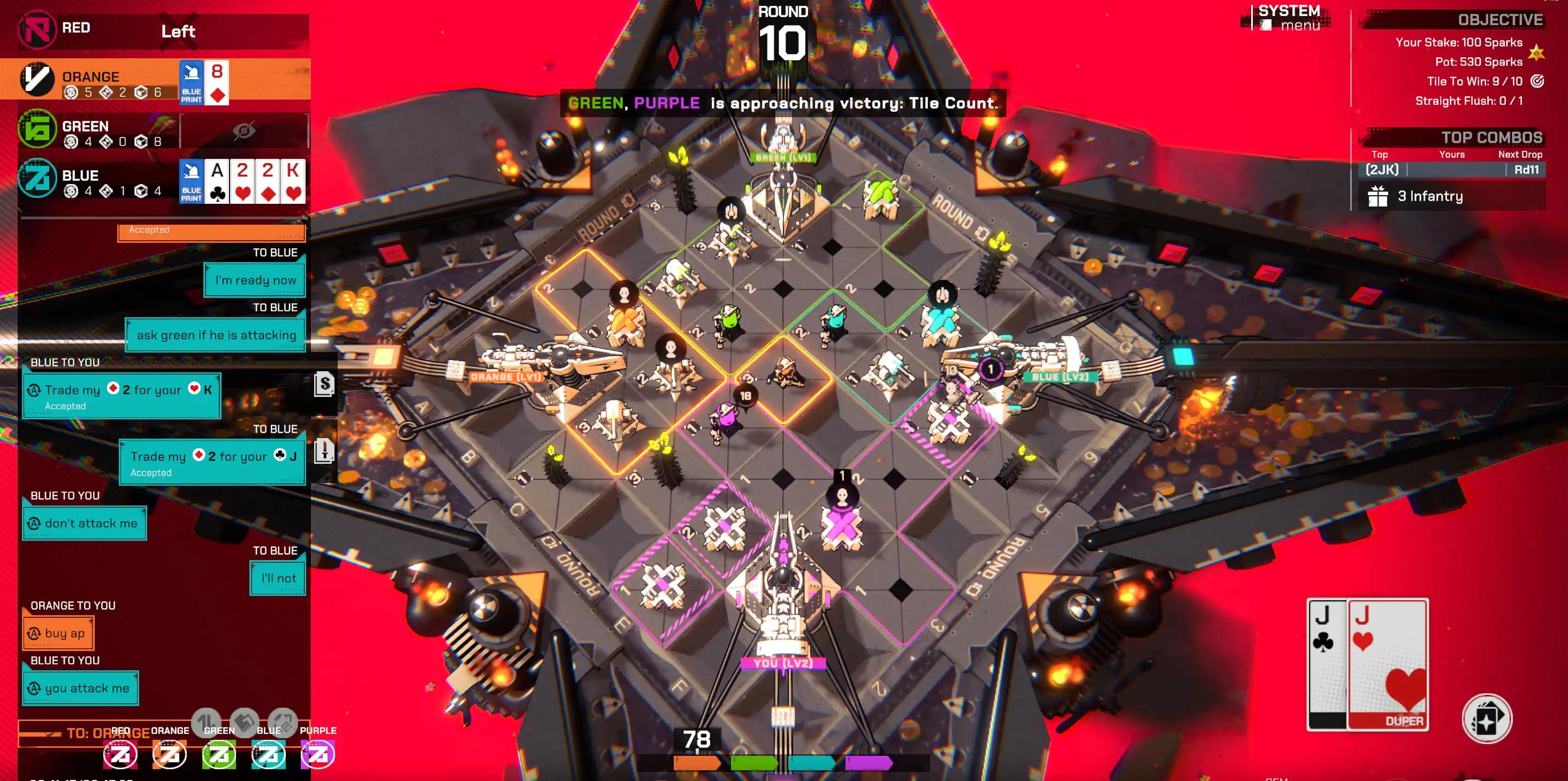 这款游戏总体上来说是一款社交战略游戏,因为在游戏里达成胜利的条件是先占领到 11 个地图格或者一副同花顺,出兵占领地图和手牌有关联,玩家可以在游戏中交换所需的手牌,最后胜利也不一定是拿到最多收益的玩家(收益分配看的是谁收集到最多宝石)。