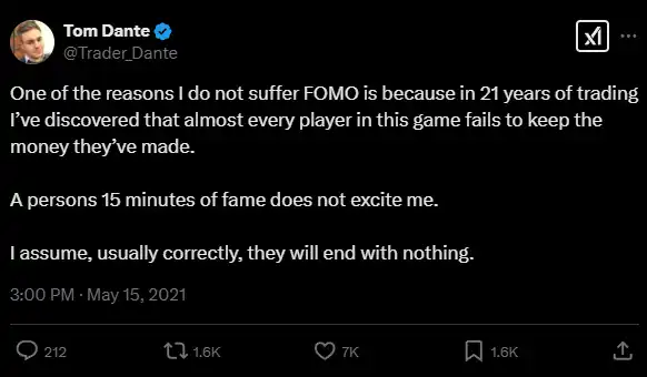 @Trader_Dante:我不会遭受 FOMO 困扰的原因之一是,在 21 年的交易生涯中,我发现几乎这个交易领域里的每一个参与者都无法守住自己赚来的钱。一个人短暂的成功并不会让我感到兴奋。我通常能正确地推测出,他们最终会一无所有。