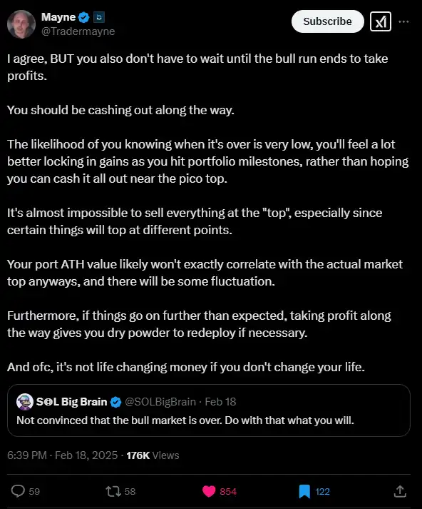 10. 对你的论点感到满意的部分原因是获利了结。当你知道你已经实现了巨大的利润,初始资金的几倍时,持有更长时间会变得容易得多。人们真的忽视了这一点。这并不容易,需要练习,但强迫自己养成这个习惯。我把 @Tradermayne 和 @Pentosh1 的这两张截图粘贴到我的投资组合表格中:
