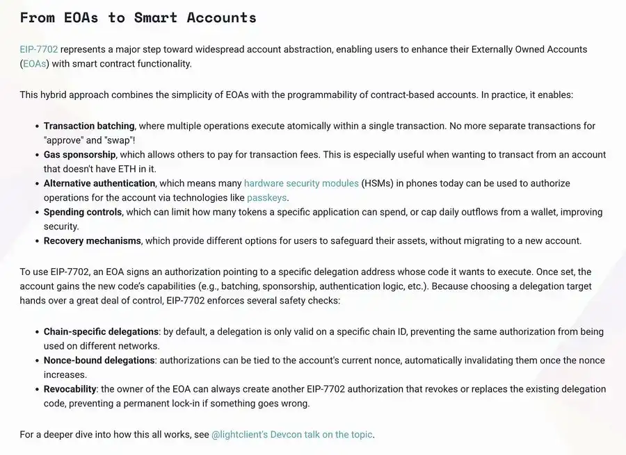 EIP-7702 将以太坊的协议层推进至账户抽象。它通过扩展以太坊的外部拥有账户(EOA)功能,加入智能合约功能,包括: