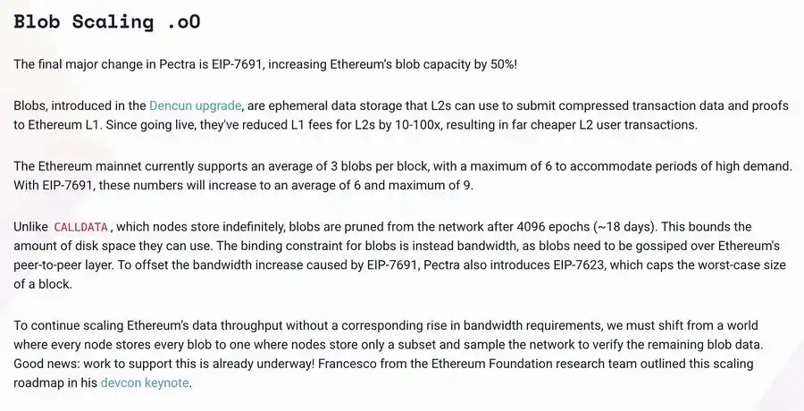 ·EIP-7623:EIP-7623 提议增加 calldata 成本,是对 L2 影响较大的开发之一。该提案旨在调整调用数据成本,以应对平均(100KB)和最大区块大小(7.15 MB)之间的差异。这不会影响普通用户,仅涉及主要用于发布数据的交易。
