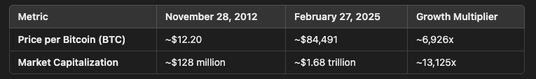 比特币的首次减半发生在 2012 年 11 月 28 日,此后市值暴涨了 13,125 倍: