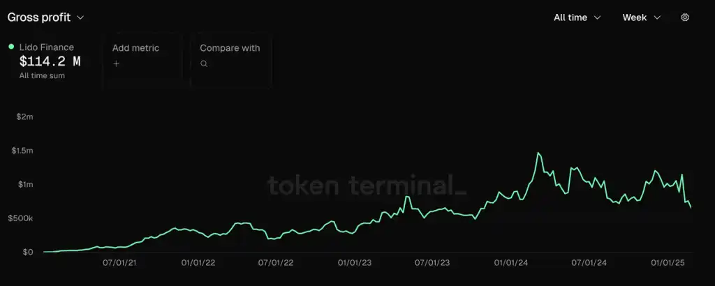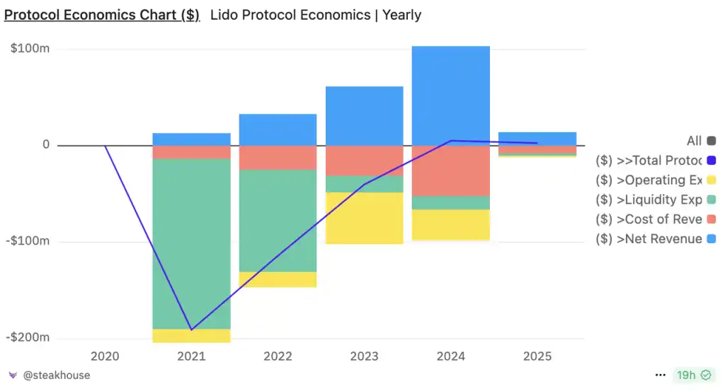Lido 协议经济(图中蓝紫色折线为协议「净利润」)来源:Dune