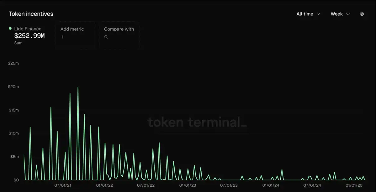 Lido 在协议上线的前两年(2021-2022),花费了巨量的 LDO 代币激励,用于激励其 stETH 与 ETH 的流动性,在两年时间内累计花掉超过 2 亿美元的代币激励,也使得 Lido 在 2021 年 5 月中国禁止 BTC 挖矿、2022 年 5 月 LUNA 崩盘和 2022 年 11 月 FTX 崩盘等剧烈的市场流动性危机中仍然保证了 ETH 的流动性,获得了目前在以太坊网络流动性质押的领先地位。