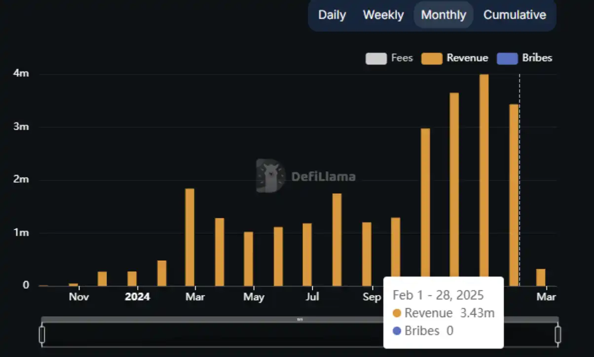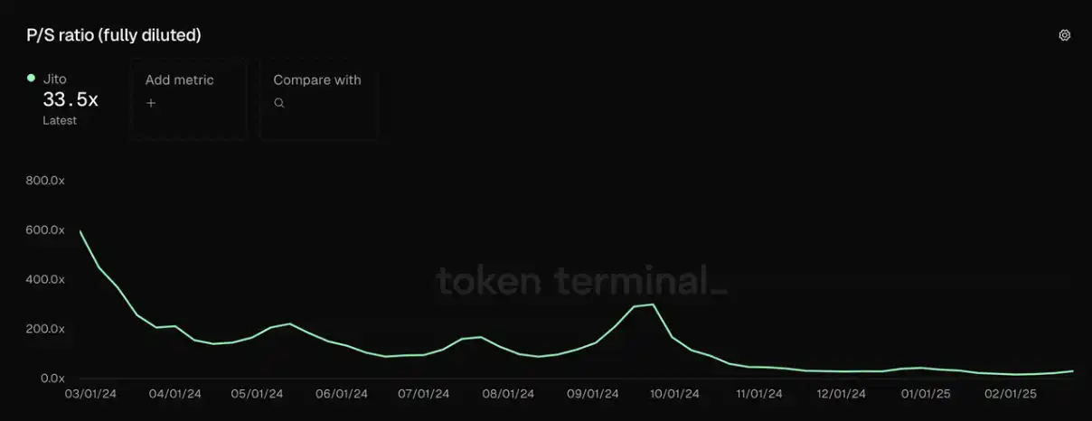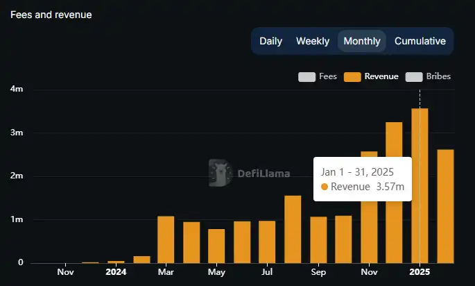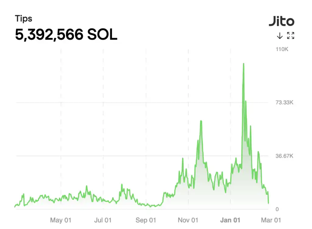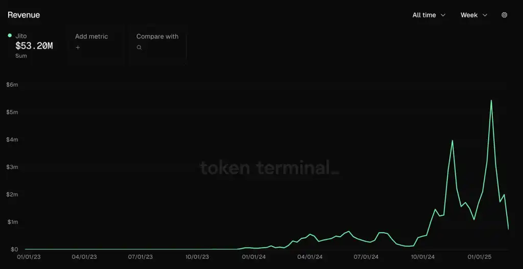 可以看出,Jito 的收入与 Solana 网络热度完全相关,其收入从 24 年 10 月开始比起之前有了数量级的提升,每周收入都超过 100 万美金,而且这部分收入有两个显著高点:11 月 20 日和 1 月 20 日,当周 Jito 的协议收入分别高达 400 万美金和 540 万美金,对应的也是链上的两个大的投机热潮。不过近期 Solana 链上遇冷之后其收入也迅速下降。