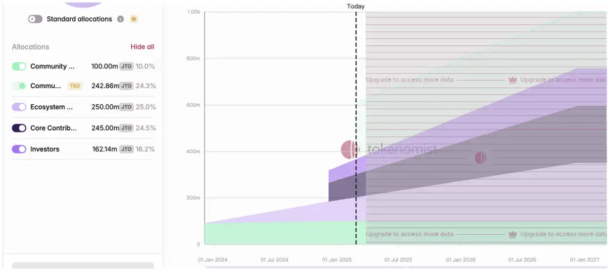 从投资的角度,另外一个可能的风险则是 JTO 代币的流通比例只有不足 40%,在去年 12 月刚刚有 15% 的大比例解锁,且在未来 2 年内都会持续线性解锁,在未来一年内的通胀率达到 62%,来自早期投资者的抛售压力也是潜在的风险因素。