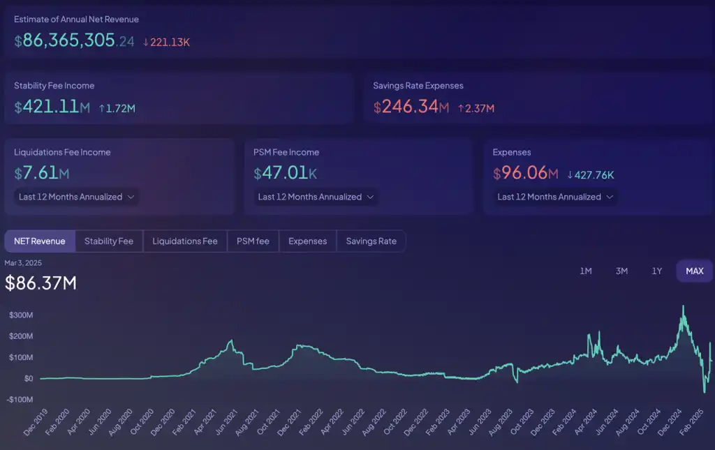 MakerDAO 与借贷协议的协议收入相对应的概念,应该是协议的各项收入之和,减去支付给 sDAI 和 sUSDS 的利息成本。从下图我们可以看到,目前 MakerDAO 的协议收入中,稳定费收入有 4.21 亿美元,占其收入绝大部分,其他如清算费和价格稳定模块收费对收入的贡献极小。