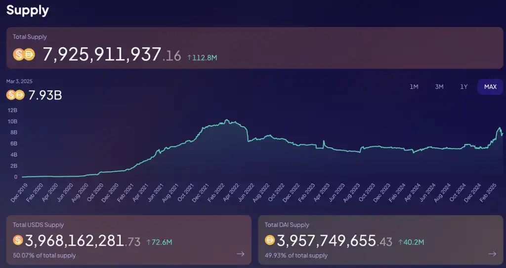 此前 MakerDAO 进行品牌升级的其中一个原因,就是其已经没有多余的 MKR 储备能对其业务的新增进行激励了。目前,MakerDAO 的代币激励主要用于激励 USDS 的存入,从 2024 年 9 月份底上线激励计划至今的 5 个月内,一共有 2.74 亿枚 SKY 激励释放,约合 1740 万美元,年化的激励金额为 4200 万美元左右。