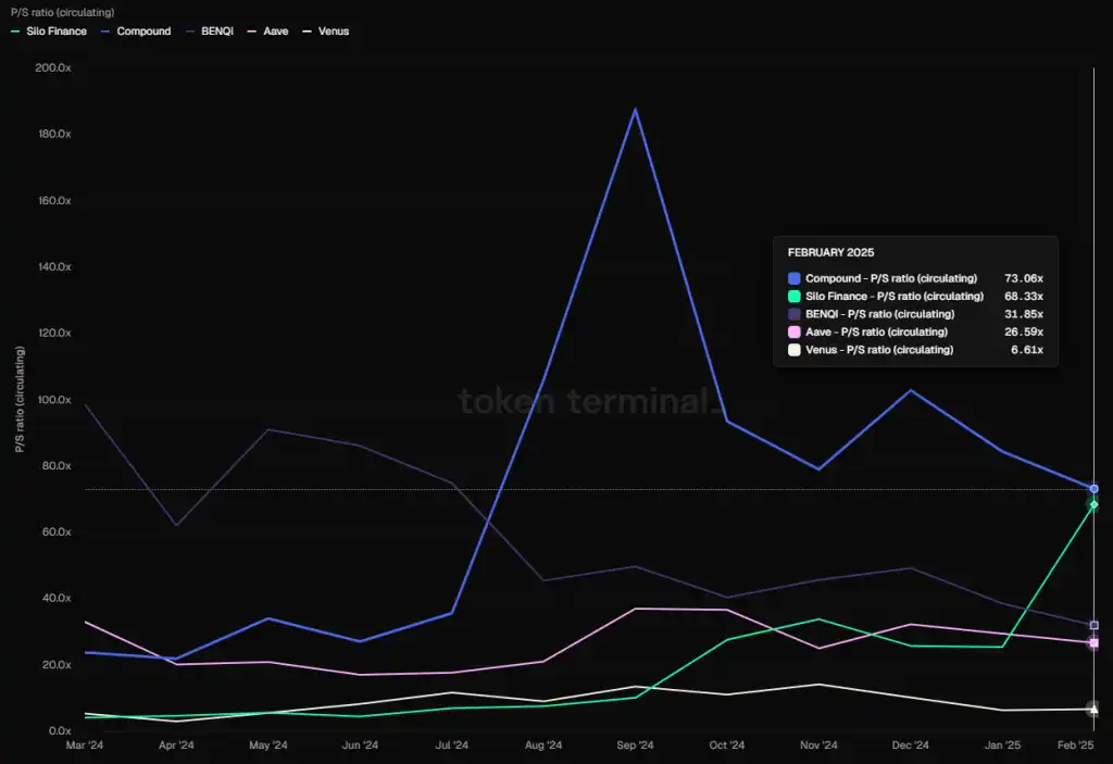 主流借贷协议的 PS(以 FDV 为基准),数据来源:Tokenterminal