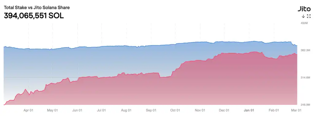 而在 MEV 领域,Jito 在 Solana 近乎处于垄断地位,目前质押的 3.94 亿枚 SOL 中,有超过 94% 都使用了 Jito 的 MEV 服务。