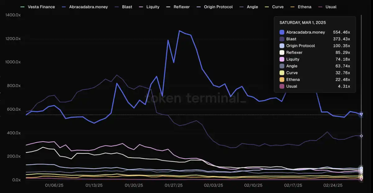 除 MakerDAO 之外稳定币项目的 PS 来源:Tokenterminal