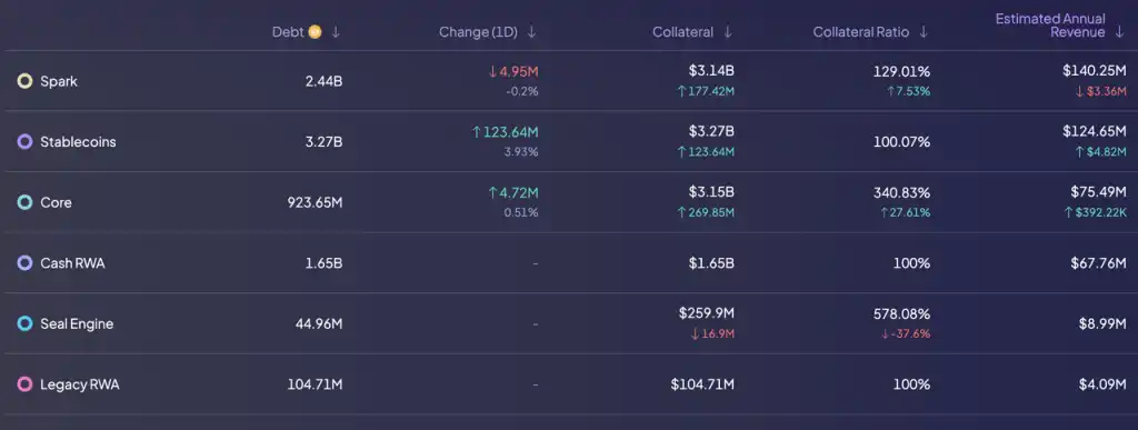 在稳定费中,协议通过 Spark 投放的 DAI 预计能够产生年化 1.4 亿美元的稳定费,USDC 直接生成的 DAI 也能获得 1.25 亿美元的稳定费,这两部分占稳定费的 2/3,其余的稳定费来自 RWA 生成的 DAI(7183 万美元)以及加密资产抵押生成的 DAI(7861 万美元)。