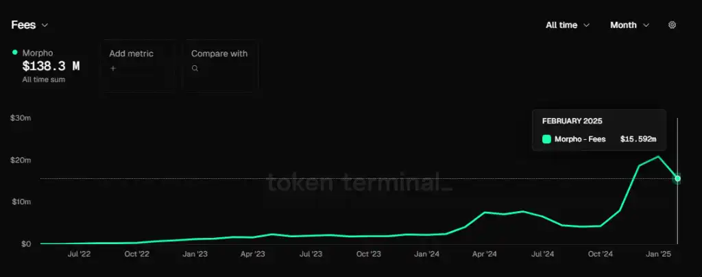 25 年 2 月,Aave 产生的 Fee 总计 6712 万美金,而 Morpho 为 1559 万美金。