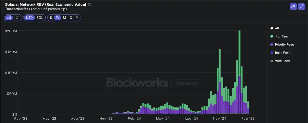 Solana 网络的 REV(即用户支付的全部费用)来源:Blockworks