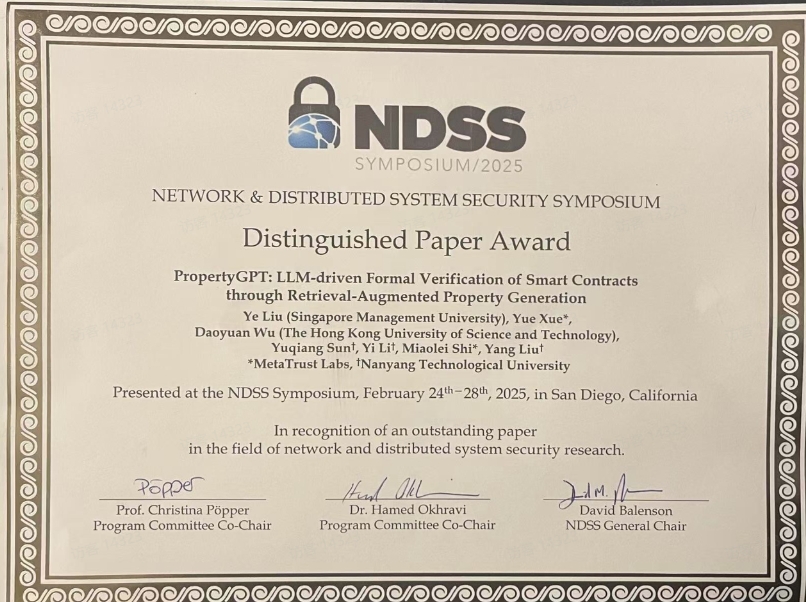 加利福尼亚州圣地亚哥 - 2025 年 2 月 27 日 - 第 32 届网络与分布式系统安全研讨会(NDSS 2025)将其备受瞩目的「杰出论文奖」授予了《PropertyGPT:通过检索增强属性生成的 LLM 驱动的智能合约形式化验证》。这项开创性的研究由 MetaTrust Labs 和 AgentLayer 的研究人员与顶尖学术机构合作完成,引入了一种利用大型语言模型(LLM)来自动化和增强形式化验证流程的创新方法。