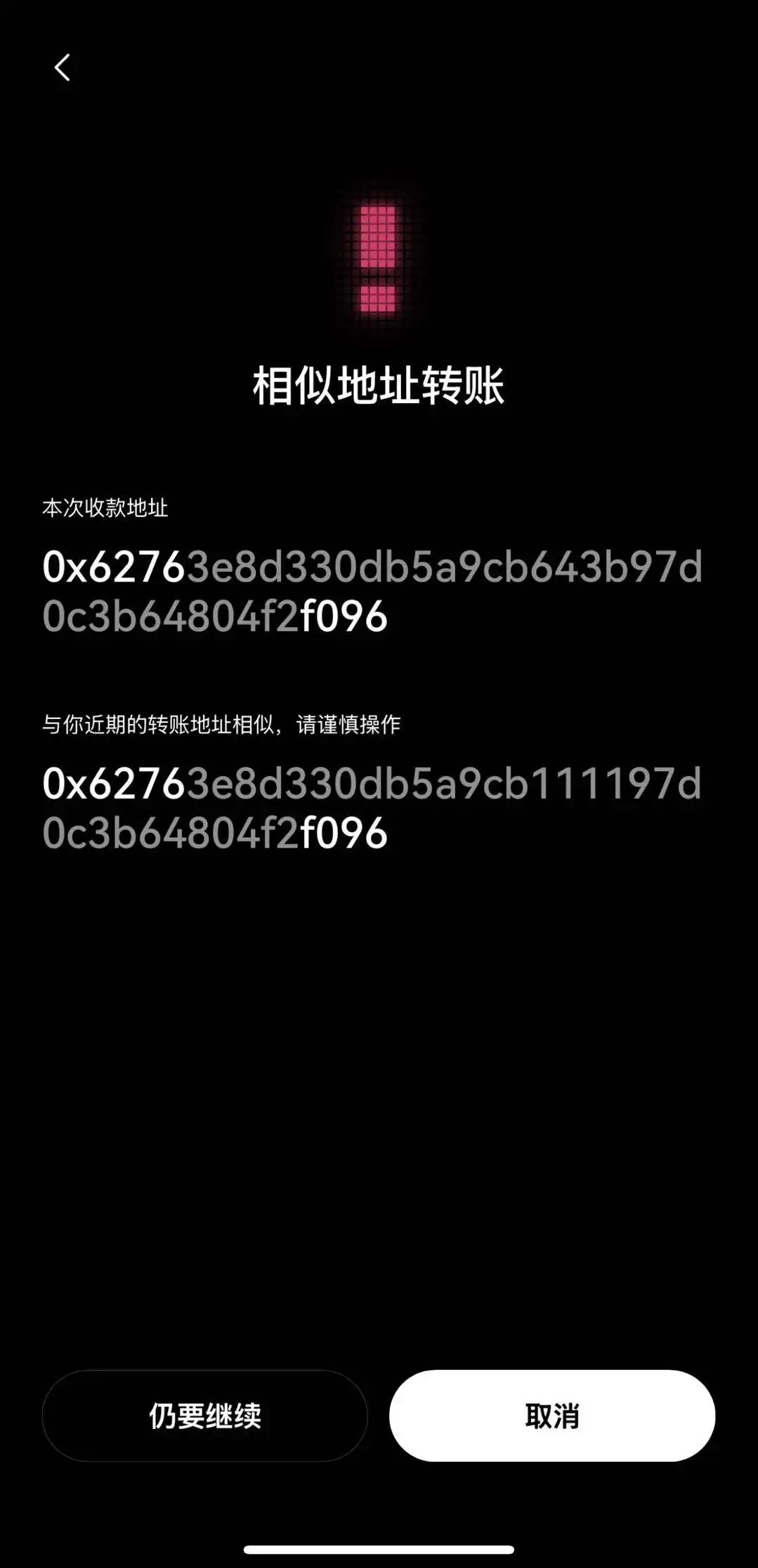 骗子常通过创建与我们常用交互地址高度相似的地址进行欺诈,例如将 0x1230...321 修改为 0x1238...32,诱导我们转账到错误地址,肉眼看过去几乎没差别,很多时候我们一不注意就被骗了。还好 OKX Web3 钱包会检测转账地址的相似性,并在发现异常时进行风险提示,帮助我们确认转账目标,避免因疏忽而将资金转入骗子手中。