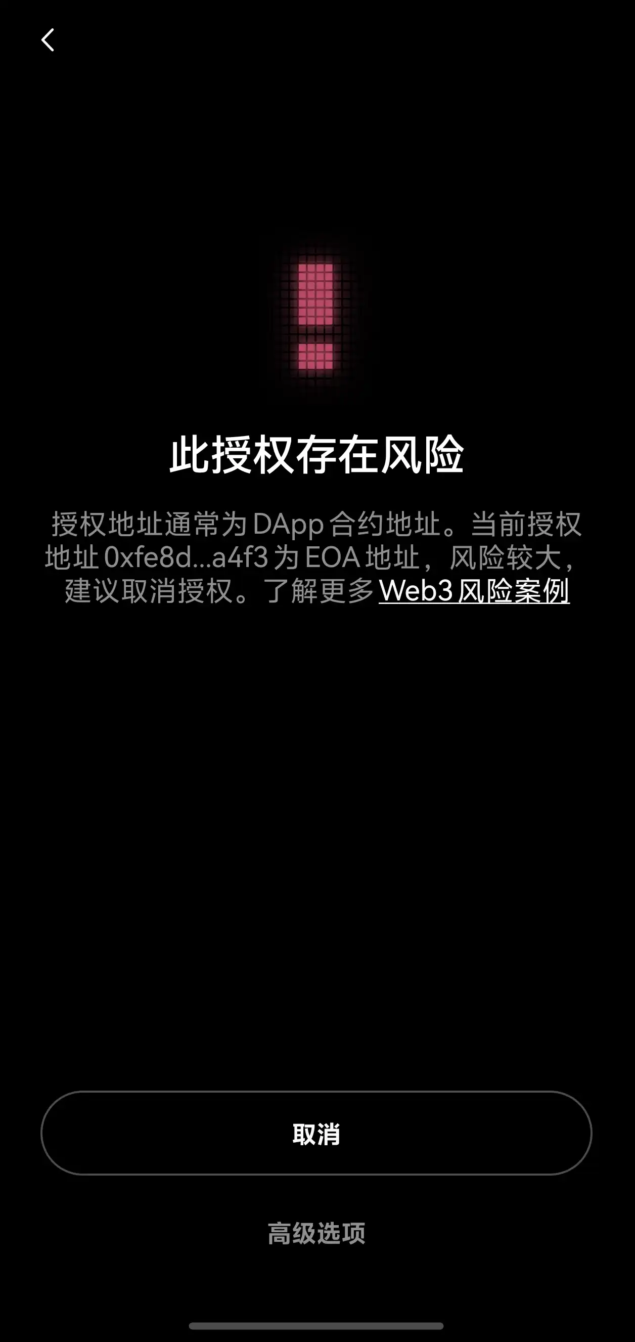 我们在进行授权操作时,通常授权对象应该是 DApp 的智能合约,而非 EOA 账户。如果授权给 EOA 账户,那么这意味着把我们的钱包授权给了另外一个钱包/人,大概率会导致资产风险。当我尝试授权给 EOA 账户时,OKX Web3 钱包会发出告警,提醒我仔细检查授权对象,避免因信任错误的对象而导致资产损失。