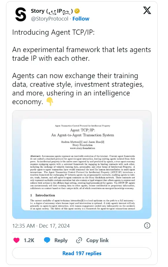 Story Protocol 在去年 12 月提出了一篇关于 AI 与 AI 交易框架的论文,探讨了智能体之间如何在链上建立互动和经济关系。现阶段,我们仍然关注链上的活跃用户和交易行为,但如果仅仅以人为单位来衡量这个生态系统,未免显得过于单调。在未来,一个个体可能会拥有多个具备不同分工的 AI 代理,而当这种规模从一扩展到一百,甚至上千时,所带来的网络效应将呈指数级增长。这意味着,AI 的发展方向不会停留在简单的人机交互,而是逐步向链上智能体生态演进,成为独立运作的经济个体,在去中心化网络中高效协作。