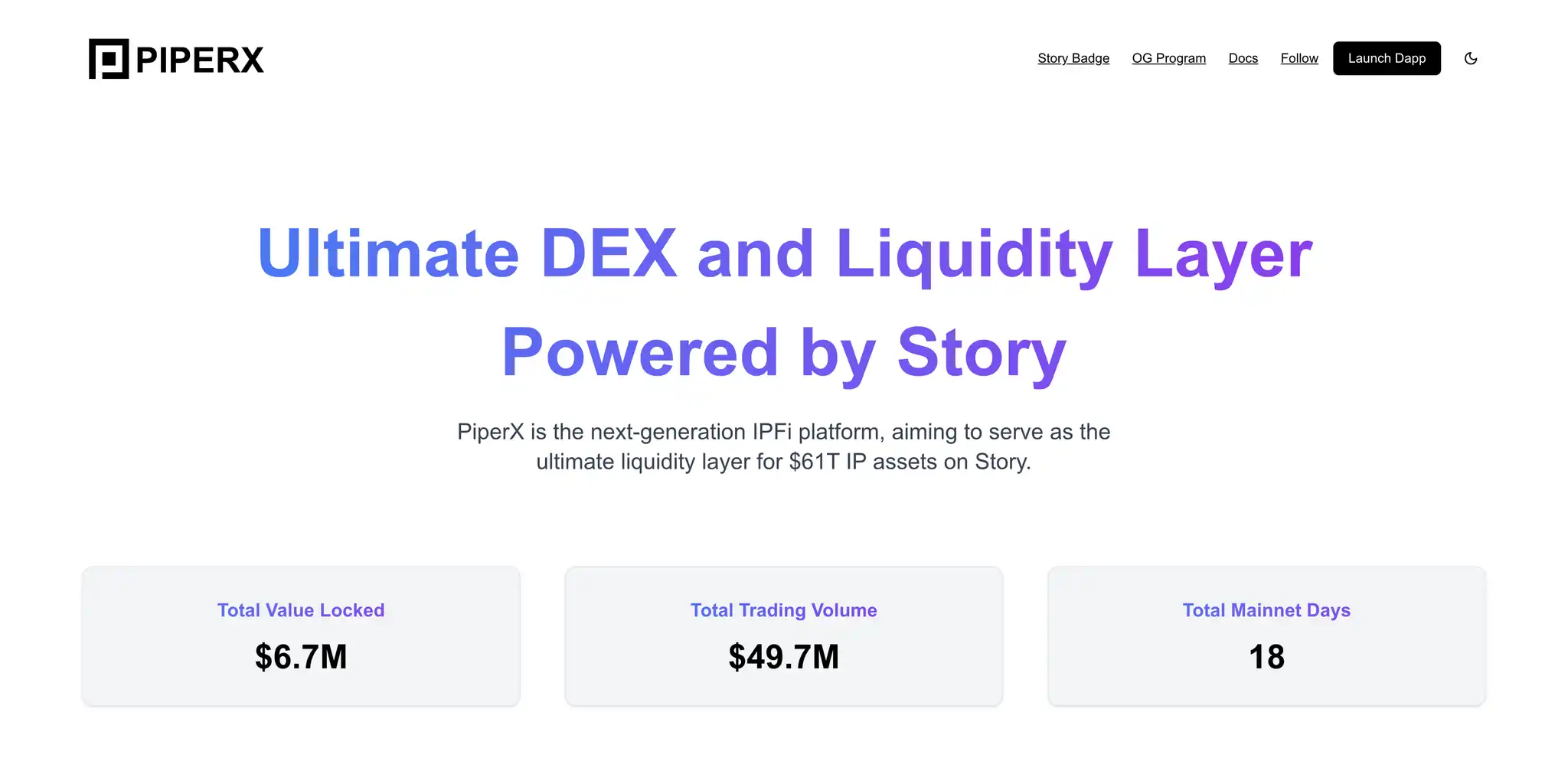 根据主页数据显示,PiperX 距 IP 主网上线 18 天以来,总 TVL 达到$6.7M,总交易量为$49.7M