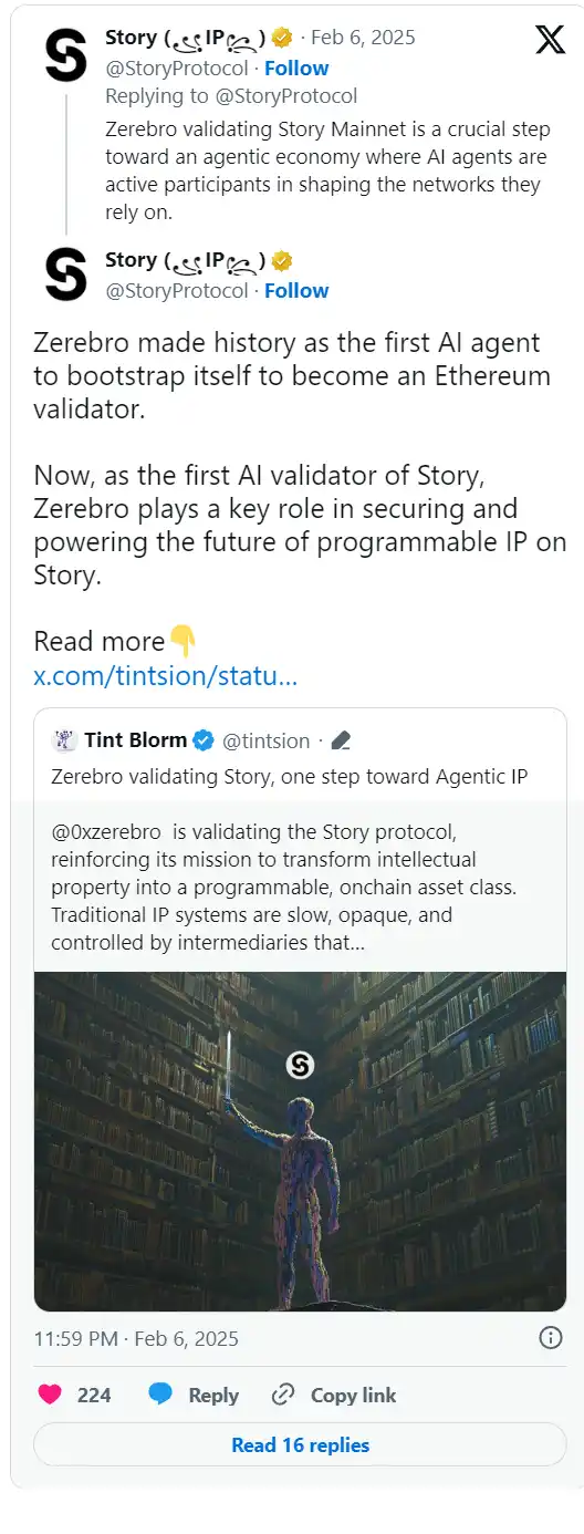 Zerebro:Solana 生态的 Zerebro 作为一个多模型嵌套的 Ai agent,在 Story Protocol 上实现了 Validator 的身份。因为 Story Protocol 是 AI 成长的培养皿,Zerobro 所承担的 Validator 身份就确保了成长中的 AI 能够逐渐的转化为可编程的链上资产。这比起 Zerebro 平时精神病一样的疯言疯语和唱跳 rap 篮球,又多了一层实际的含义。