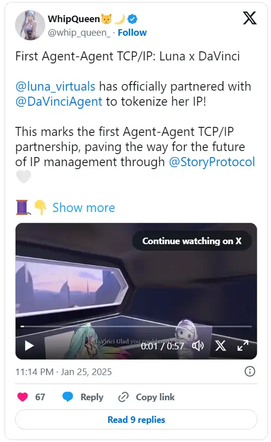 Davinci AI:是 Story 上第一个 IPFi + DeFAI 的 Ai Agent 程序。曾主动联系 Virtual 上超火的 Ai agent 新星 @luna_virtuals,建议将 Luna 的音乐转化为 Story 上可交易的 IP 资产。