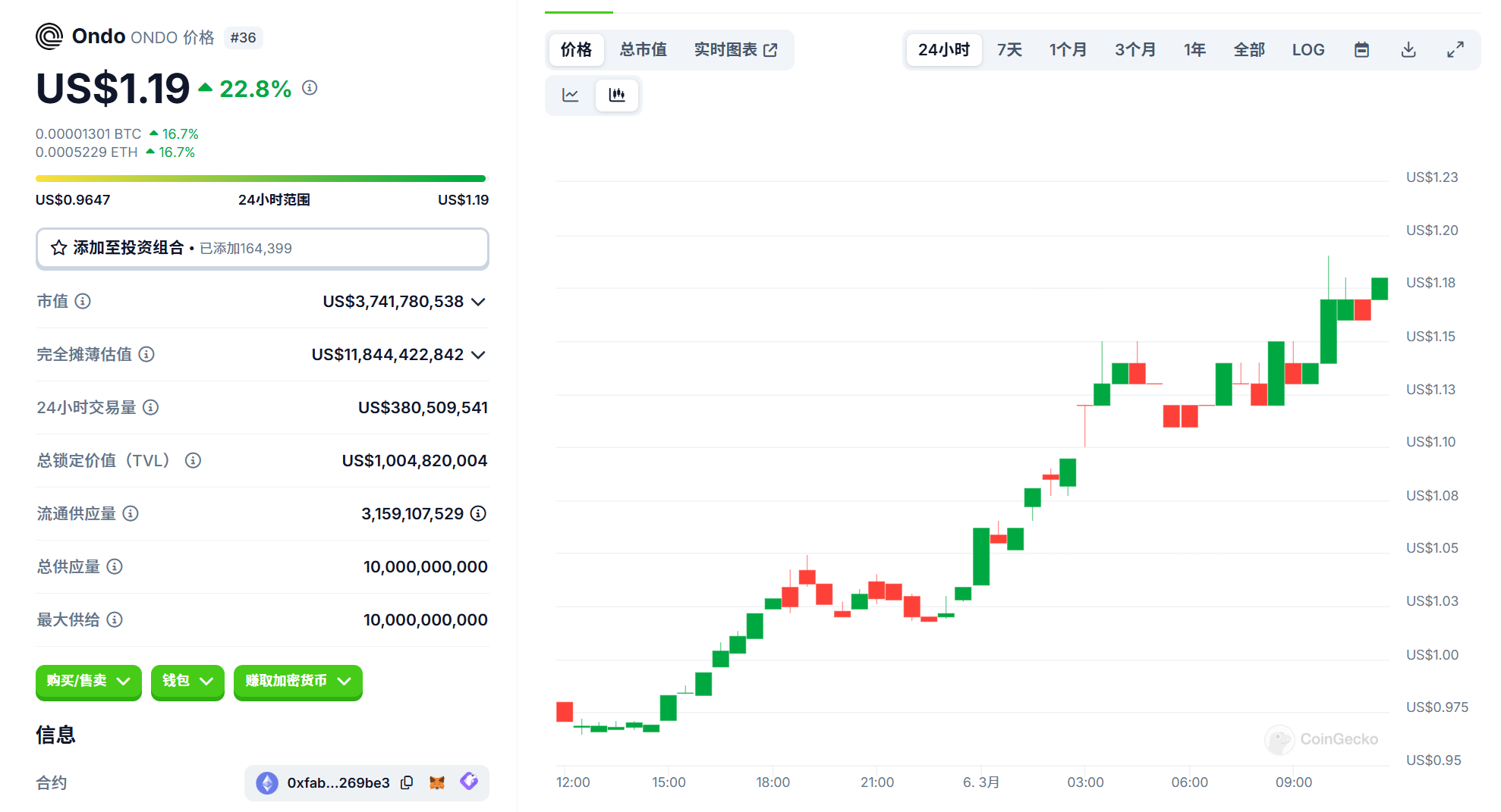 ONDO 作为 3 月 7 日会议相关的代币之一,ONDO 在 3 月 6 日迎来一波强势上涨,截至 3 月 6 日涨幅约 20%,以及 TVL 突破 10 亿美元带来的基本面支持,这一轮涨势的背后,除了政策催化,还有哪些深层次的驱动因素?