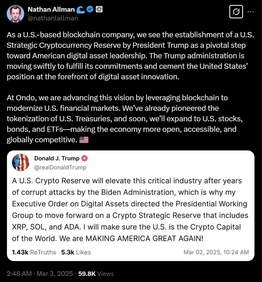 Nathan Allman 针对美国加密货币战略储备的做法表示赞同,「作为一家总部位于美国的区块链公司,我们认为特朗普总统建立美国战略加密货币储备是迈向美国数字资产领导地位的关键一步。」