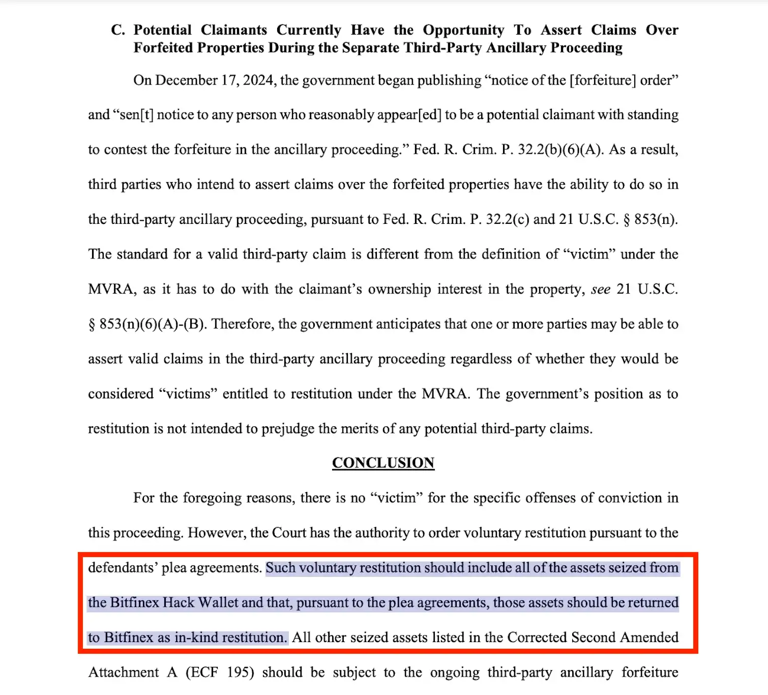 2024 年 10 ⽉,哥伦⽐亚特区美国检察官办公室提交了⼀份动议,暗示 Bitfinex 可能是根据《犯罪受害者权利法案》(CVRA)和《强制受害者赔偿法案》(MVRA)有资格获得赔偿的「唯⼀受害者」。这⼀⽴场在 2025 年 1 ⽉的⼀份⽂件中得到了强化,政府提议将⽐特币「以实物」(BTC,⽽不是现⾦)返还给 Bitfinex。