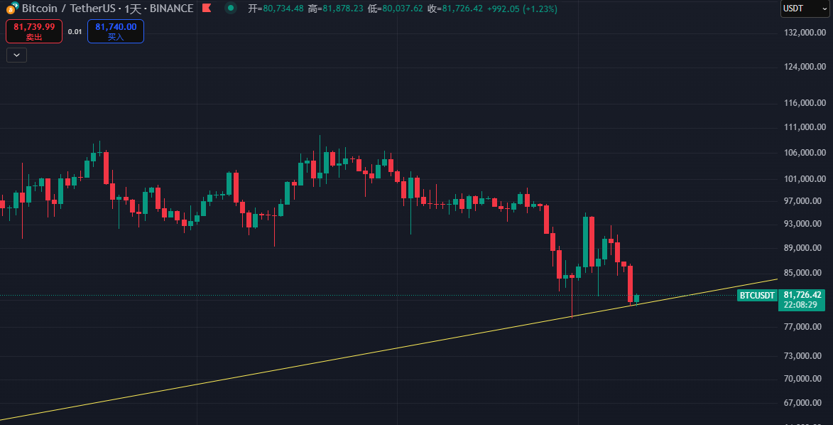 · 路径一:时间换空间 若$78,000 成为底部,多空双方需耐心等待两三个月以确认趋势。当前,50 日均线(约$77,500)与 200 日均线(约$72,000)之间的区间成为短期博弈焦点。若价格能守住$78,000,可能形成 W 底形态,为后续反弹奠定基础。