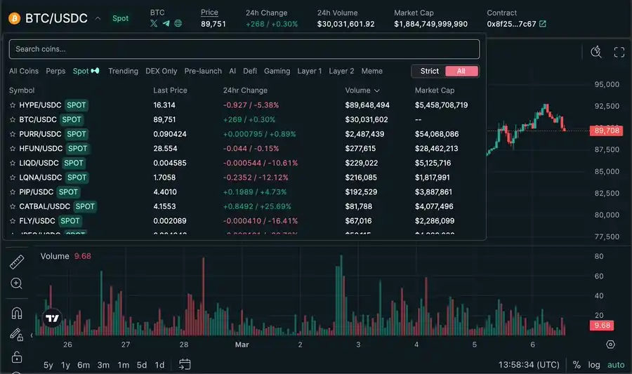 相比于 Hyperliquid 庞大的 1.06 万亿美元永续合约市场,现货交易起步较小,但增长迅速。截至 2025 年初,随着关键更新(尤其是 BTC 的上线),Hyperliquid 正在逐步成为链上现货交易的有力竞争者。
