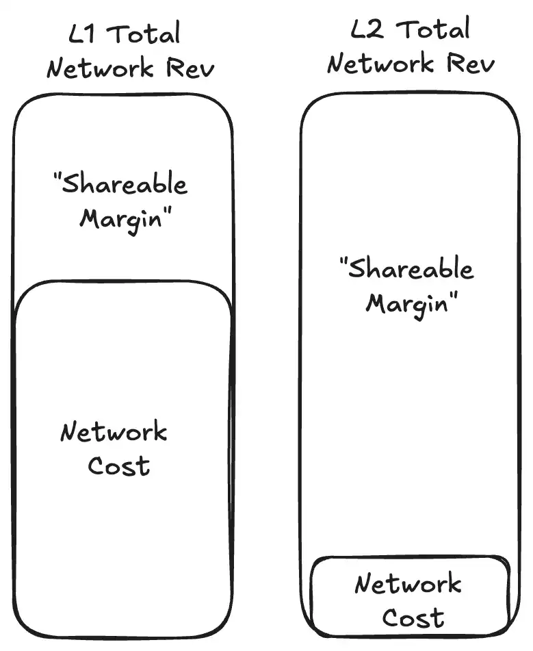 相比于 拥有大量验证者的 L1,L2 维持盈亏平衡所需的利润率极小。这意味着,在保持相同利润率的情况下,L2 可以将更多价值分配给 dApp 生态,从而大幅提升 dApp 的收益空间。