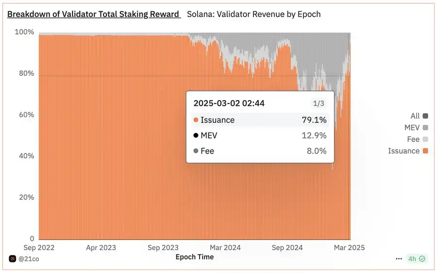 以太坊的情况类似,但受影响较小。目前,ETH 质押的 APR(年化收益率)在 2.9%-3.6% 之间,其中约 20% 来自 REV。这也意味着,Ethereum 在优化 dApp 收益的能力上,同样受到验证者盈利要求的约束。