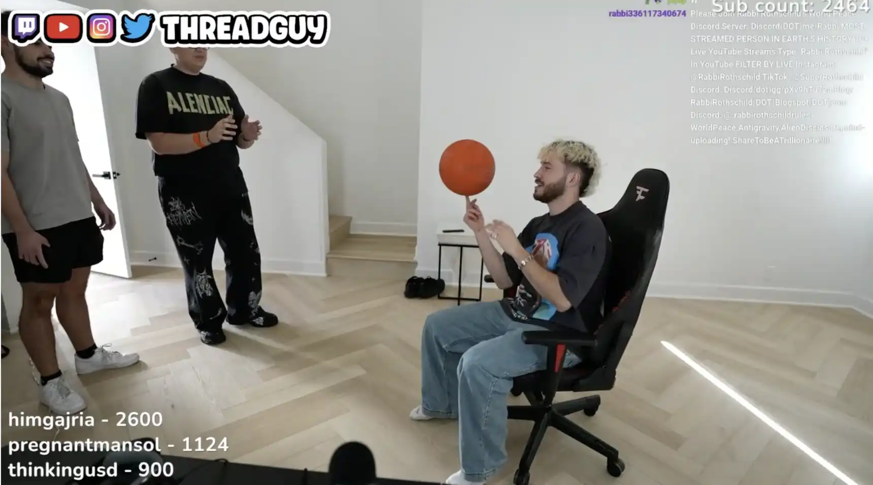 1 月 16 日是 threadguy 的 23 岁生日,他在直播中兴奋的介绍自己的新录音室,甚至在空荡的房间里打滚。朋友敲门进来送给 threadguy 一个篮球,计划晚上带他去看湖人的比赛,并且是坐在场边席位。threadguy 开心地转着手中的篮球,显然已经从 Andrew Tate 的阴影中走了出来。