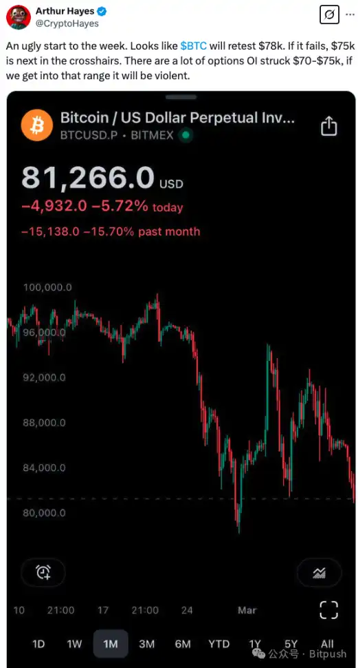 BitMEX 联合创始人、加密领域知名人士 Arthur Hayes 此前的预言似乎正在应验。他曾预测比特币可能跌至 7.5 万美元,而随着市场情绪恶化,这一预测正变得愈发可信。
