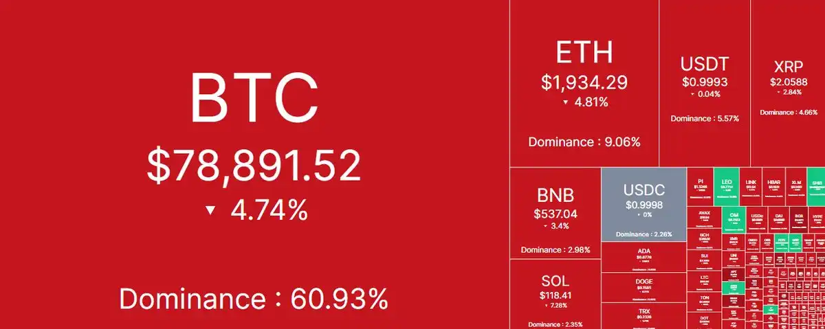 今天的美股「黑色星期一」带崩加密市场,比特币最低触及 76,600 美元,创近 4 个月以来的新低,基本回到去年特朗普胜选时的水平。ETH、SOL 等在内的主流山寨币同样遭到血洗,以太坊跌破 1800 美元,创下自 2023 年 10 月以来最低。据 Alternative 数据,加密货币恐慌与贪婪指数为 24(昨日为 20),市场情绪仍处于「极度恐慌」状态。