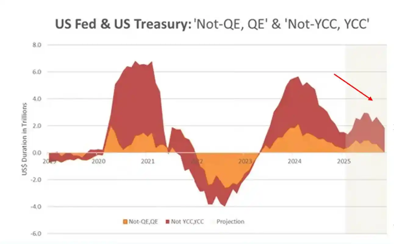 据估计,上述「秘密刺激」在 24 年初为美国市场增加了 5.7 万亿美元。这是通过耗尽逆回购 + 在票据中提前发行新债来实现的。