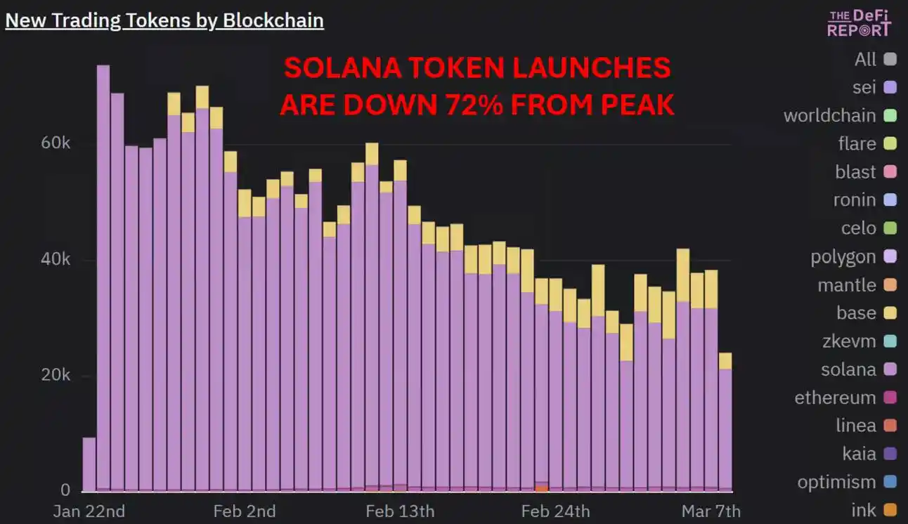Solana 上的代币发行数量相比峰值下降了 72%。尽管如此,该链每天仍有超过 20,000 个代币被创建。