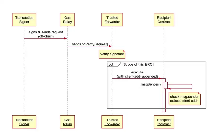 随后,Gas Relay(后台服务)接收交易签名数据,并负责将交易提交至区块链。Gas Relay 通过 受信任的转发者(Trusted Forwarder)进行交互,确保交易可以合法执行。Trusted Forwarder 合约在上链前会对签名的合法性进行验证,并防止重放攻击(Replay Attack)。验证通过后,它会与接收者合约(Recipient)交互,最终完成交易执行。