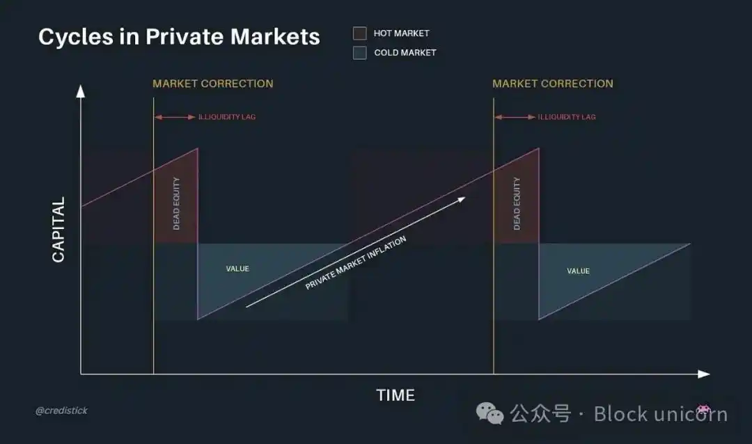 风险投资等私人资本市场在流动性过剩和稀缺之间摇摆。当这些资产变得流动且外部资本涌入时,市场的狂热会推动价格上涨。想想新推出的 IPO 或代币发行。新发现的流动性使投资者承担更多风险,这反过来又推动了新一代公司的诞生。当资产价格上涨时,投资者寻求将资金转移到早期应用中,希望获得比 ETH 和 SOL 等基准更高的回报。这是一个特性,而非错误。